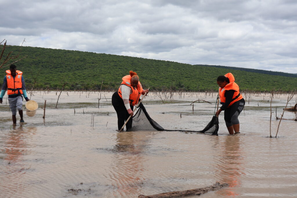 The research visit covered several dams and tributaries in Palapye, Mmadinare and Selibe-Phikwe within the Limpopo River catchment, where the teams assessed fish diversity and identified specimens to species level. To support the training, NRF-SAIAB brought a range of sampling equipment, including: hand throw casting nets, fyke nets, seine nets, and D‑nets. This enabled participants to engage directly with multiple field techniques and fish identification guides (Figure. 1).