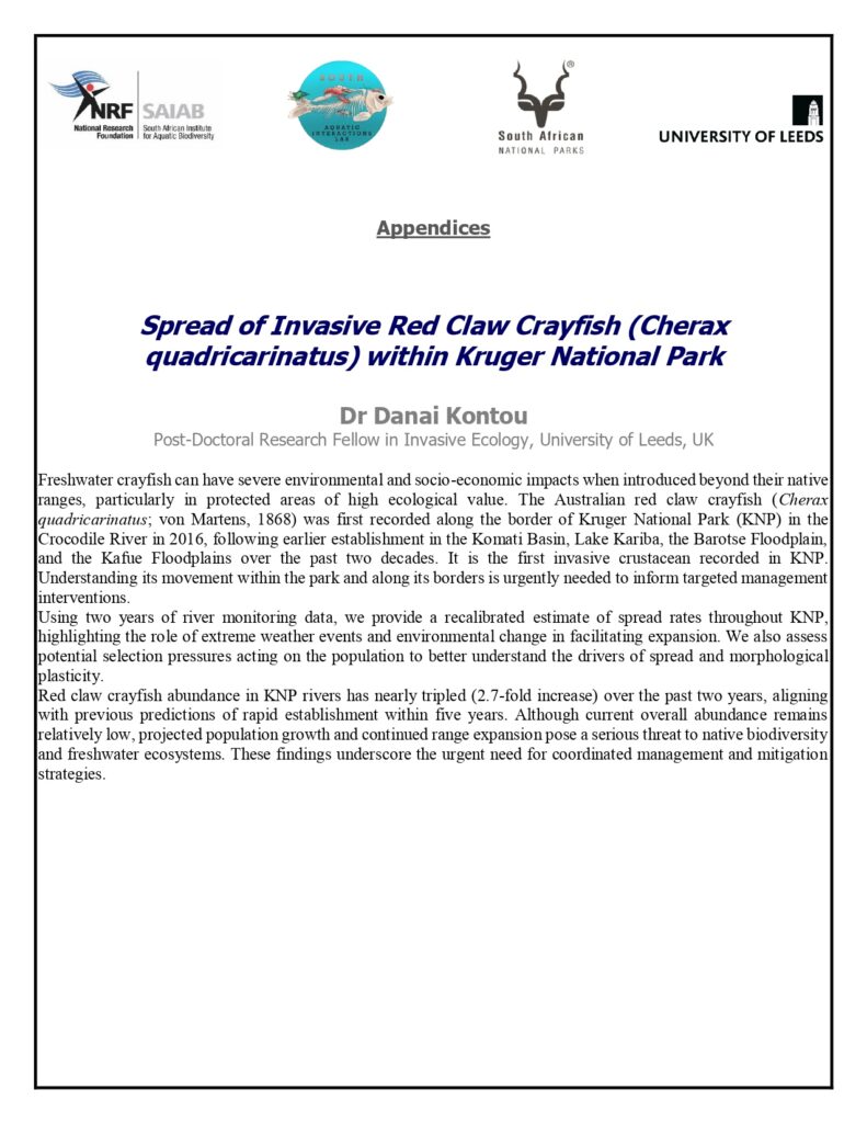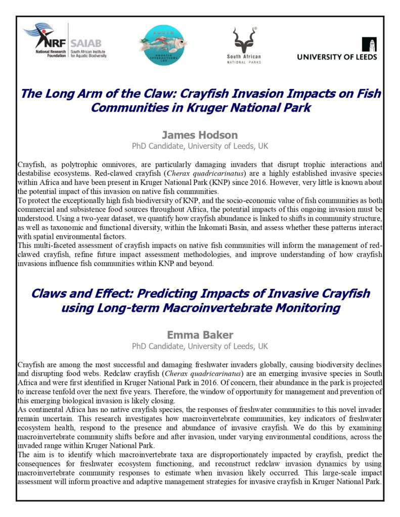 Redclaw crayfish (Cherax quadricarinatus), first recorded in Kruger National Park in 2016, are rapidly expanding invasive freshwater species with serious ecological consequences. This seminar series explores the invasion from multiple perspectives: Dr Danai Kontou examines spread rates and population dynamics; James Hodson investigates how crayfish alternative fish communities and biodiversity; and Emma Baker uses long-term macroinvertebrate monitoring to predict ecosystem-level impacts and identify vulnerable taxa. Together, these talks provide a comprehensive view of how redclaw crayfish are reshaping freshwater ecosystems in Kruger National Park and inform strategies for proactive, adaptive management.